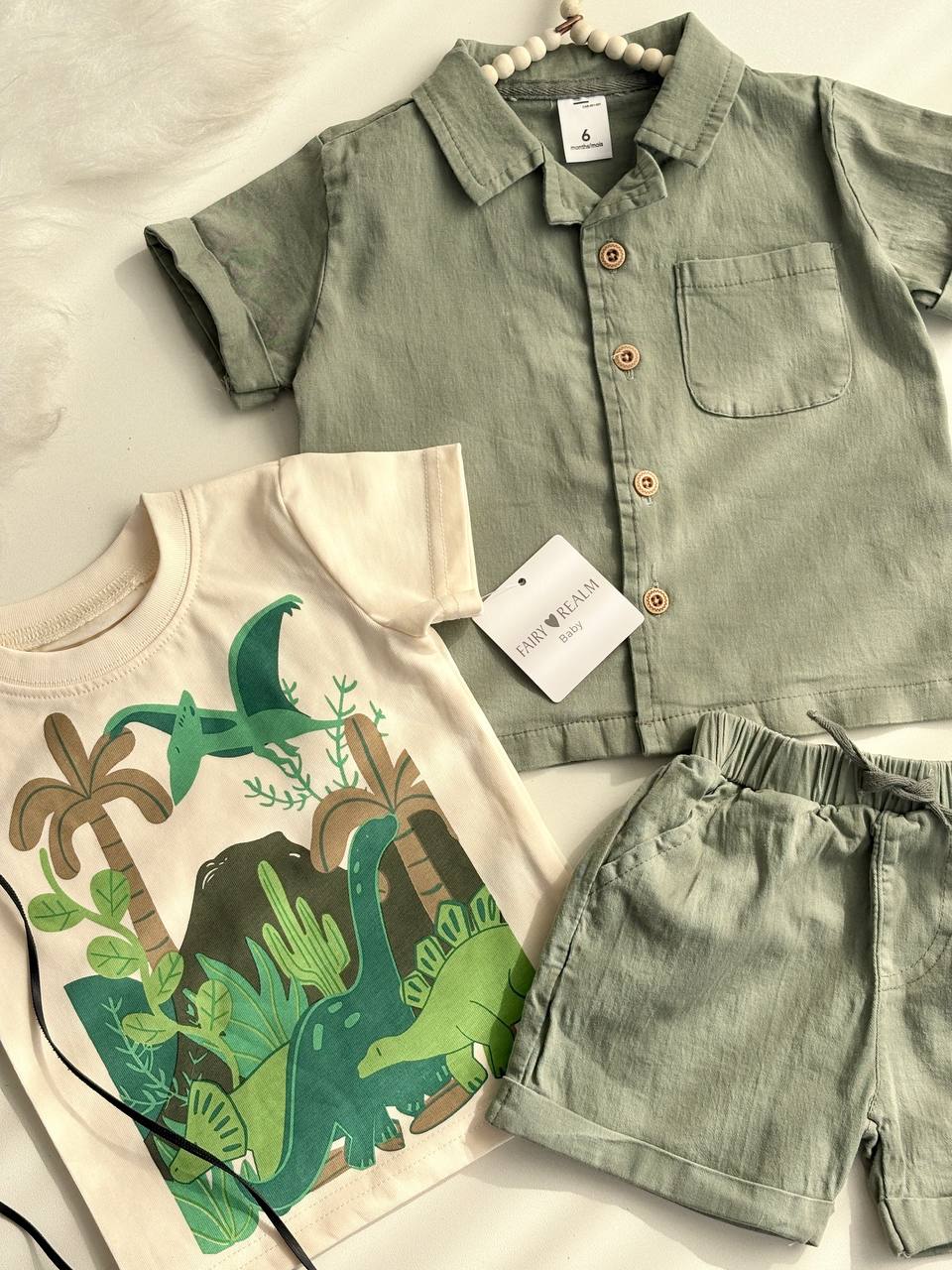 اگر به دنبال یک استایل جذاب، خاص و در عین حال راحت برای پسر کوچولوی خود هستید، این ست سه تکه با تم دایناسور دقیقا همان چیزیست که نیاز دارید! این ست کامل و شیک، شامل یک دست پیراهن مجلسی، یک تیشرت نخی و یک شلوارک تابستانی است که با ترکیب هوشمندانهاش، گزینهای ایدهآل برای مهمانیها، دورهمیهای خانوادگی و حتی استفاده روزمره در فصلهای بهار و تابستان محسوب میشود.